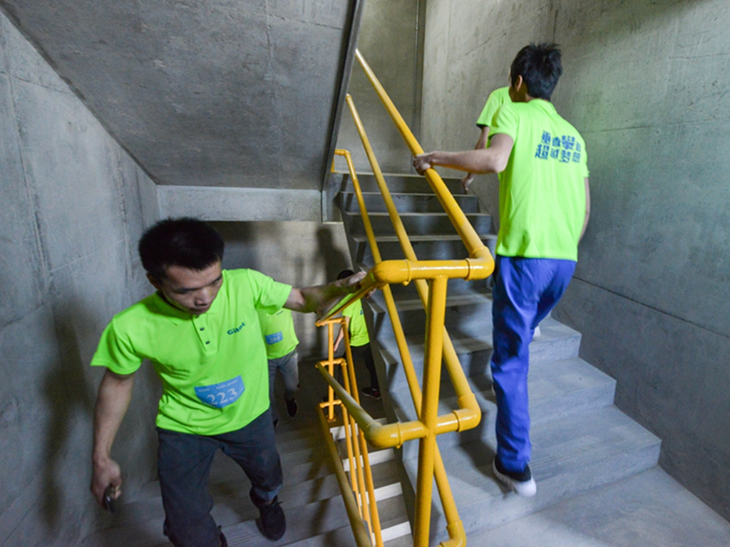 一聲令響,選手們分組出發(fā),向頂峰發(fā)起挑戰(zhàn),用奮進(jìn)的腳步垂直穿越巨龍電梯試驗(yàn)塔,競演一場階梯快速對決。攀登188米(相當(dāng)于70層樓房)的垂直高度并不輕松,半程過后許多選手體力不支,需憑毅力,借助樓梯扶手繼續(xù)向上攀登,階梯上留下選手們的足跡,也灑下艱辛的汗水。